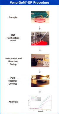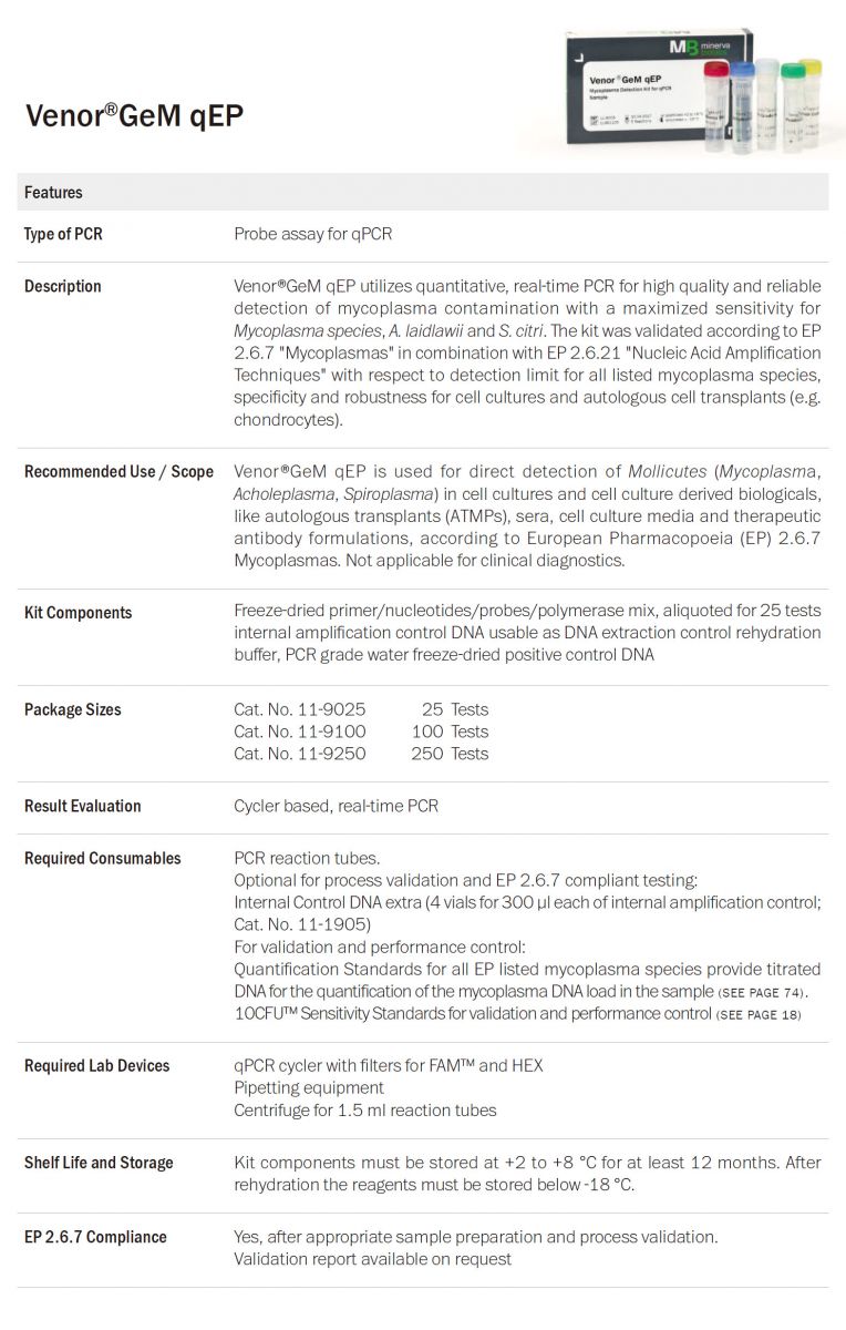VenorGeM 利用PCR且針對在細胞培養時易污染的Mycoplasma與Acholeplasma 作高敏感的檢測。引子(primers)乃專一性在高保守的rRNA的啟動區或是16srRNA的轉錄區,所以可以針對所有的Mycoplasma,Acholeplasma及Ureaplasma等菌株。菌核及其他細菌DNA均不被VenorGeM 所放大。僅一簡單步聚,3小時內可完成。VenorGeM 提供internal control DNA,故每次成功的PCR均會看到一條191 bp的PCR產物於電泳膠中。