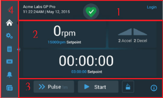 顯示離心機名稱、當前日期和時間、裝置的整體健康狀態,以及在啟動密碼保護時出現的登錄區域。 - 2. "主"螢幕區域: