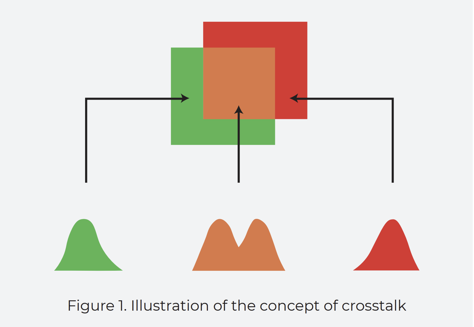 串擾是指螢光團之間的訊號串擾,其中一種螢光團的發射光譜與另一種螢光團的偵測範圍重疊。這會導致假陽性訊號和目標蛋白定量不準確。